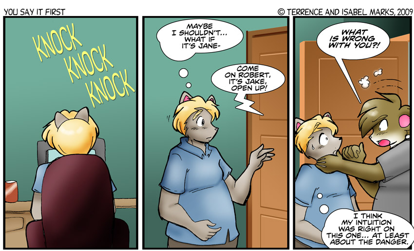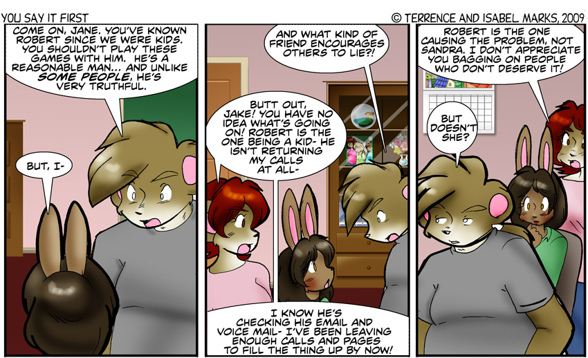 Original Commentary It had been my intention to make some new items for Jane's (and Jake's... although I doubt he's paying rent) living room from the start of it's showing (has Jane's place been shown before? Bah, if so she redecorated... nothing brings up a gal's spirits more than redecorating... or so I've heard- our own place is a designer's nightmare, so what would I know?), but we've both had sore throats for the last three days... we're getting better, but I just ended up not having much energy for the past few days, so in the end, the last two comics ended up having very plain backgrounds. Last night I was up till six am drawing today's comics- and even then I barely got them up at time...but at least I used the extra time I had today to make new backgrounds for this comic. The cabinet is new- the only thing borrowed are it's contents (the photo is one of Robert, Jane and Jake when they were kids... I have a feeling that photo has been up for years, even before Jane and Robert got together). The flowers are from Twix's flower shop (the ultimate recycling back ground file), the books on the bottom shelf are from Ya Ta comics and the collector's plate is new. There is also a brand new drawer to go with the cabinet, but it doesn't get much showing. The calendar is somewhat new... the image in it came from a really old ND comic. I'm glad I finally got to make them... just in time for them not to show up again for a bit. >< -Isabel Modern Commentary Sandra is, unfortunately, too nice to yell back at him - Terrence |