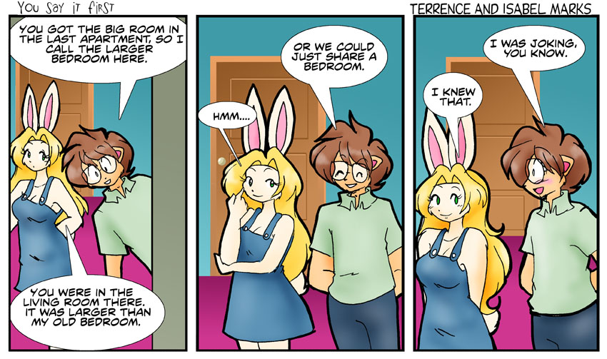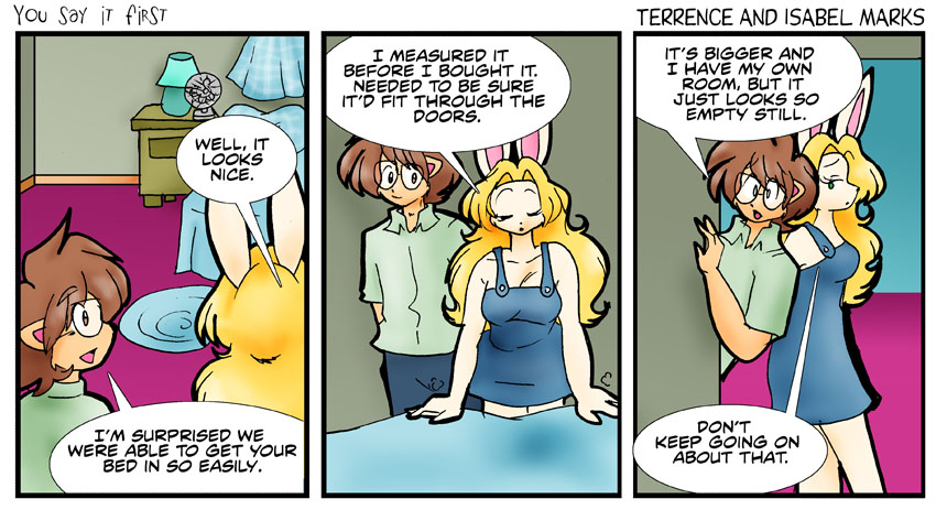 He probably bought it with his own money. He didn't try suggesting that they share a bed, because Kimberly might say no or - and he's not sure which one scares him more - she might say yes.