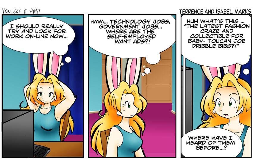 From my personal experience, looking for work on-line is really a pain the butt. Of course, Terrence has had nothing but good experiences with on-line job searches. I'm sure the more you read this arc, the more you'll see who wrote the story arc. -Isabel