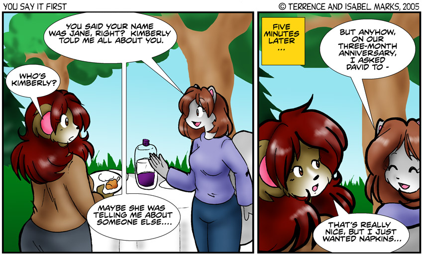 I like the basic structure of this story, I just wish I had come up with a better plan for Kimberly than "hide the food at the picnic". It's not really funny enough or destructive enough or creative enough. - Terrence  Friday, May 20th 2005 - [302]A Picnic in the Park (17 of 24)