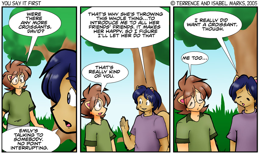 I'm wondering about the eight people Emily invited. On one hand, we weren't going to spend too much time on background folks who we'll never see again. But in-comic, I'm assuming that half of them left because the picnic was out of food and the other half left because there was some crazy lady going around hiding things in the trees.