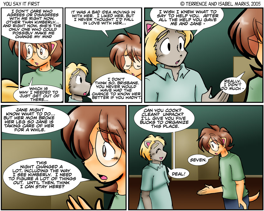 I ended up tweaking the script to this comic the entire day. There were little changes, like adding a little foreshadowing (not telling where, sorry :P), an explanation for why Robert was not surprised to see Brisbane at his door unannounced (first panel) and making him look a little more clueless over all (the entire comic). Roberts a funny guy- he makes a guy like Brisbane look more together (of course, right now Brisbane is falling apart, but, well, every other time Robert has shown up he has). I'm sure Robert hasn't even noticed Brisbane's box, considering there are so many in his place already. -Isabel