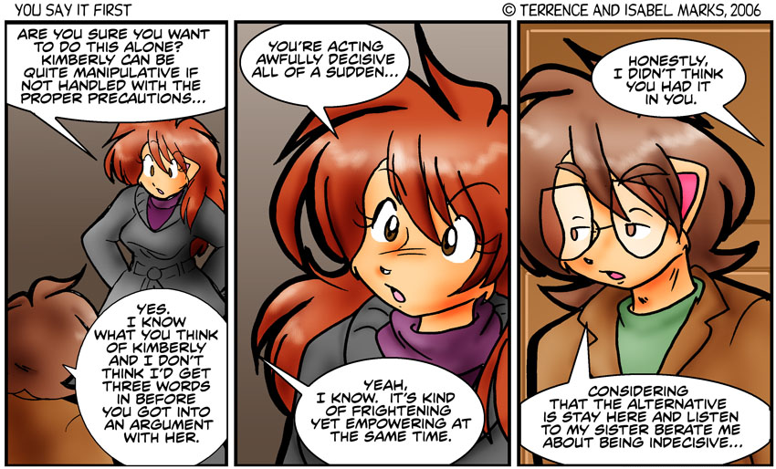 And that's why we didn't have Sofia go with Brisbane. It would've been very interesting, but I can't see it being very productive. Assuming that Sofia didn't start on Kimberly when they saw each other, Sofia would jump into the discussion the moment she sensed weakness on either side. But if Brisbane couldn't deal with Sofia, he definitely couldn't deal with Kimberly - Terrence