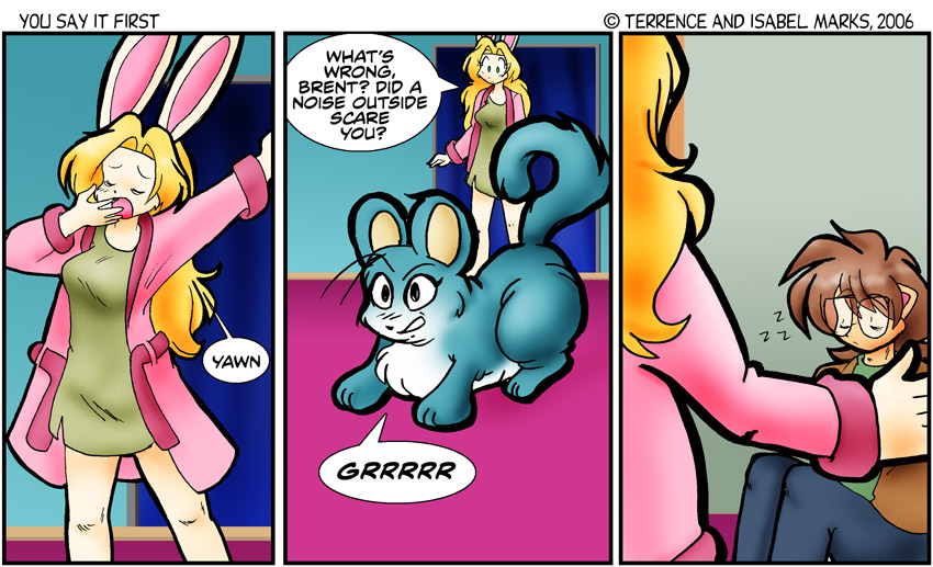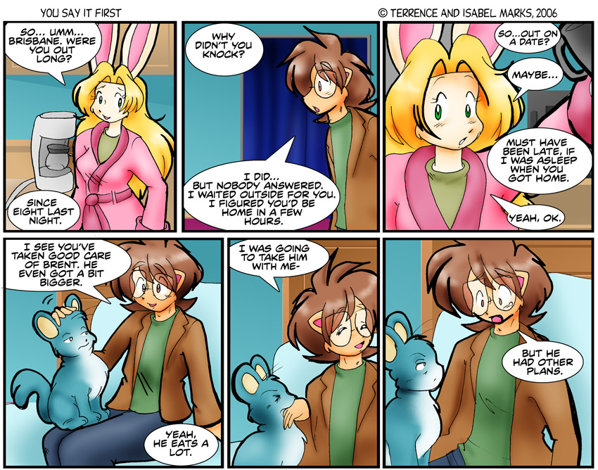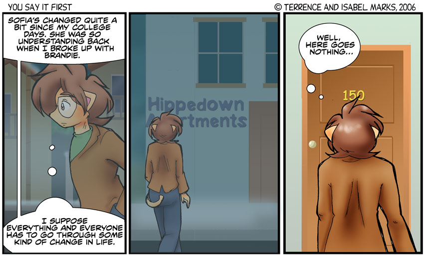 I usually try to keep the time-line within the comic as much in time with real life, but with longer story arcs such as this, you kind of have to jump around and "time travel" in order to make things go well. I think this is the first time You Say it First has done something along this line. -Isabel Modern Commentary