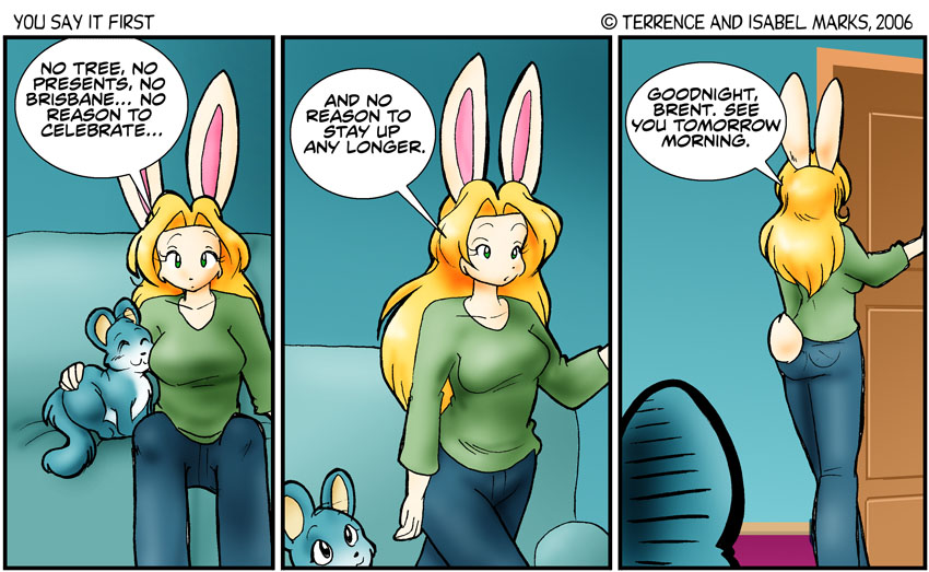 This is set an hour or so before the previous comic. Kimberly isn't going to bed right as Brisbane arrives. It makes narrative sense to show Brisbane arriving first, though. - Terrence  Friday, January 20th 2006 - [504]Looking forward to the New Year (41 of 48)