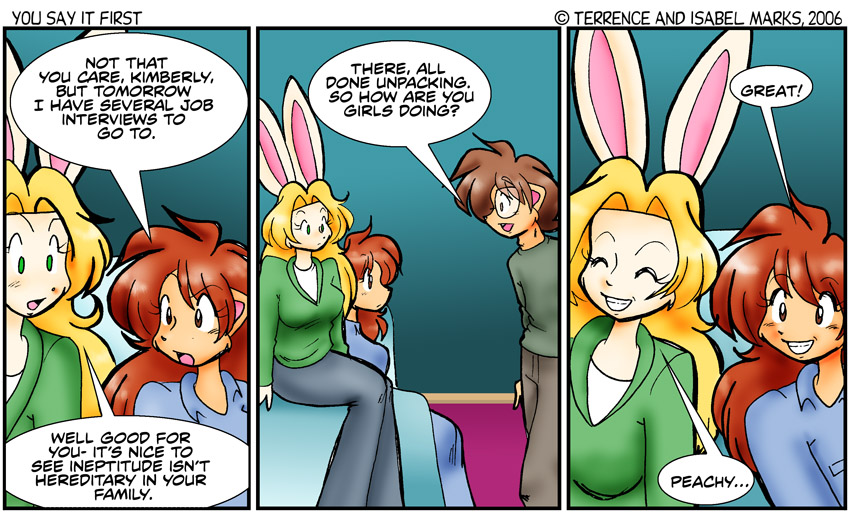 Grover Hills was a donor-only comic that ran on NamirDeiter.net. Its characters have turned up elsewhere occasionally. Tom and Cassie showed up in Namir Deiter; Blue was crushing on Tom before finding out he was married. Tom and Cassie are also Avery's grandparents over in Nicole and Derek.