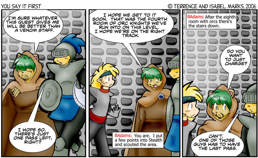 In this game, 100 hitpoints is low. You could take one or two hits, but the third would probably kill you. That's what I like about D&D numbers - five hitpoints is very definite and very easy to keep track of. 140 hitpoints in, say, a Final Fantasy game is about equivalent but if that character takes three or four hits, you have to add them up. It's a hassle. But video games breed large numbers, so they're in the high two-digit range (out of the high three-digit range, or mid four-digits in Rob_64's case). The line in the last panel was originally just "What was that?" but I wanted to make it clear that Silver_Blossom didn't just show up in the room with them - Terrence