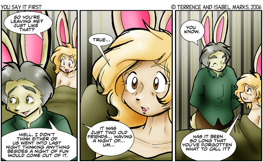 Is the comic becoming "oversexed" over the past month? Eh, not really. If anything this is more like three or so years (not counting the days of Unlike Minerva because, when I write the series, I don't COUNT those years because as far as I'm concerned the sexual frustration didn't start until they moved in, but I'm getting side tracked) of action condensed into about a month. If you don't like it, nothing I can say here will change that.