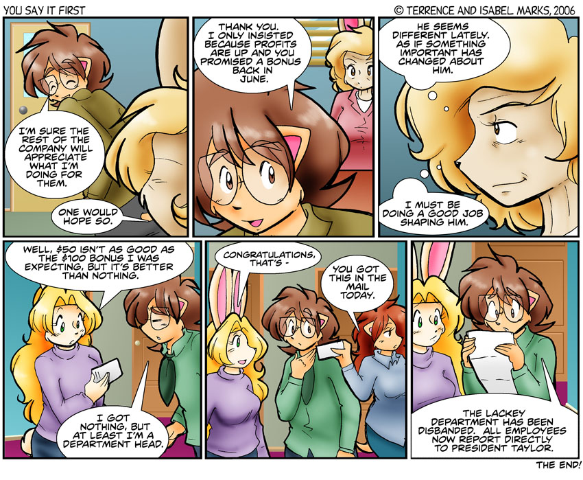 Originally the letter read Brisbane's department as "the gofer department". This was because this was Terrence's original name for it- which was in the script text file for yesterday's comic. This comic had brackets instead of any words at all for the department's title. Since Terrence lettered the comic for Friday, I did not know he made the change, so I simply copied and pasted the text from the older script's text file. I'm glad I asked Terrence to read over the comic twice, otherwise I would not have found the problem. Meh, good riddance, 2006. -Isabel