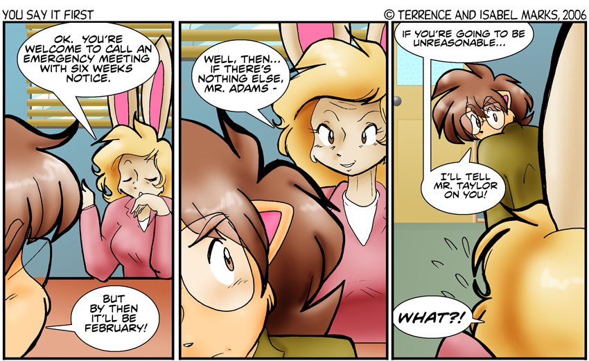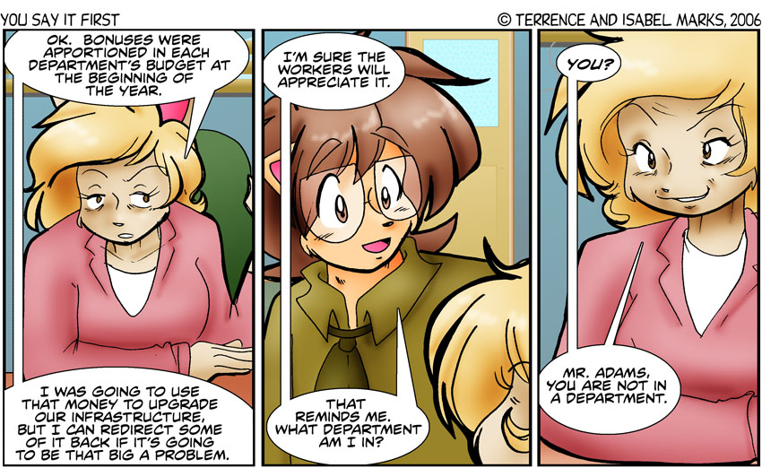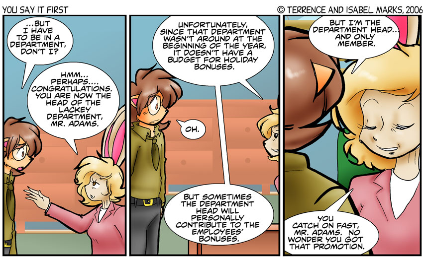 Originally the letter read Brisbane's department as "the gofer department". This was because this was Terrence's original name for it- which was in the script text file for yesterday's comic. This comic had brackets instead of any words at all for the department's title. Since Terrence lettered the comic for Friday, I did not know he made the change, so I simply copied and pasted the text from the older script's text file. I'm glad I asked Terrence to read over the comic twice, otherwise I would not have found the problem. Meh, good riddance, 2006. -Isabel