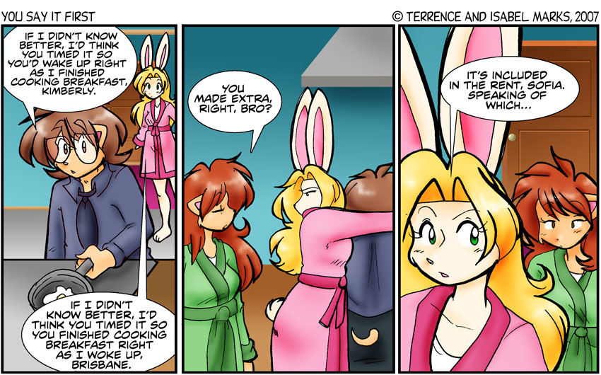 The idea behind this arc (which I foresee lasting four weeks) was to spend one comic on each pair of characters. It didn't work exactly that way - the previous comic is Brisbane/Kimberly. This comic is a little of everyone. But I'd rather err on the side of better comics than on the side of experimentalism. -Terrence Modern Commentary