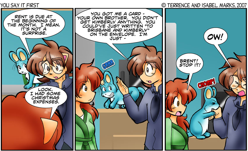 This, mind you, is the comic showing how Brisbane and Brent interact with each other, which is why Sofia doesn't have much to say. In all honesty, I pictured this comic's build-up as something like the courthouse scene in Ghostbusters 2. Except that in this case, the emotional outburst ends with a bite instead of with the Scoleri brothers - Terrence
