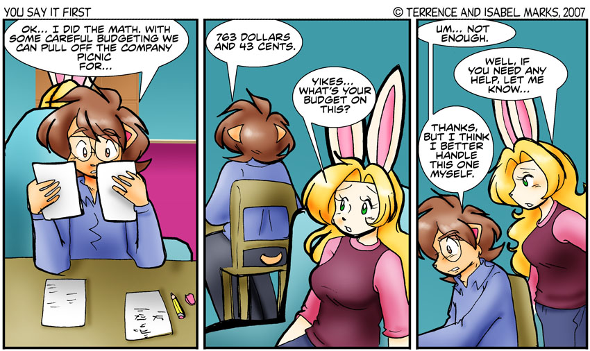 Original Commentary Brisbane is a bit frustrated in that last panel... possibly a little mad and stressed out by everything falling apart around him. This is the first project for the company that he has been entirely in charge of and nothing is going as it should be... even the meekest of people can get frustrated when put into a corner. -Isabel Modern Commentary On the other hand, it's taking a lot of his personal time and money and, even in a best-case scenario, would just be a handful of people milling about in a park and eating cheap food. Kimberly is offering to help plan. She is not offering to help pay. - Terrence ![]() Friday, June 22nd 2007 - [885]Company Picnic (11 of 12)