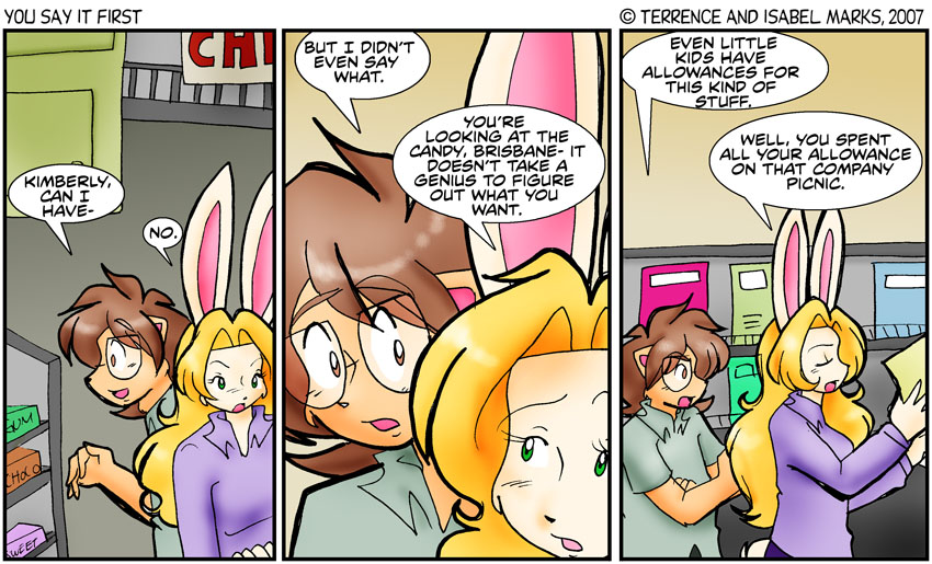 Of course, this leads to the question of "are there chicken and pigs in this work the same way there are rabbits and hedgehogs?". I still subscribe to the theory that there are ham and chicken breast trees that grow the meat like corn in husks- very fatty ham trees. I'm sure Terrence has his own ideas on this, but we can't agree so... there's no real answer right now. Just enjoy the comic. I should note that ND and YSIF are not the same as Kevin and Kell- I know it's a "no duh" thing, but every now and then people seem to assume that my world is based on Bill's. This world's rules are pretty much the same as ours except for certain little aspects here and there (like the fur and tails and such). And yes, Brisbane and Kimberly are getting into each other's nerves-Isabel