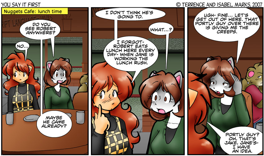 For those of you who don't recall what Jake did/does for a living: he used to work with Robert for Lemon Tech., but after an incident/ altercation with Miz Taylor decided to strike out on his own and make his own computer fixing business. His work place is more-or-less a table in Nuggets Cafe