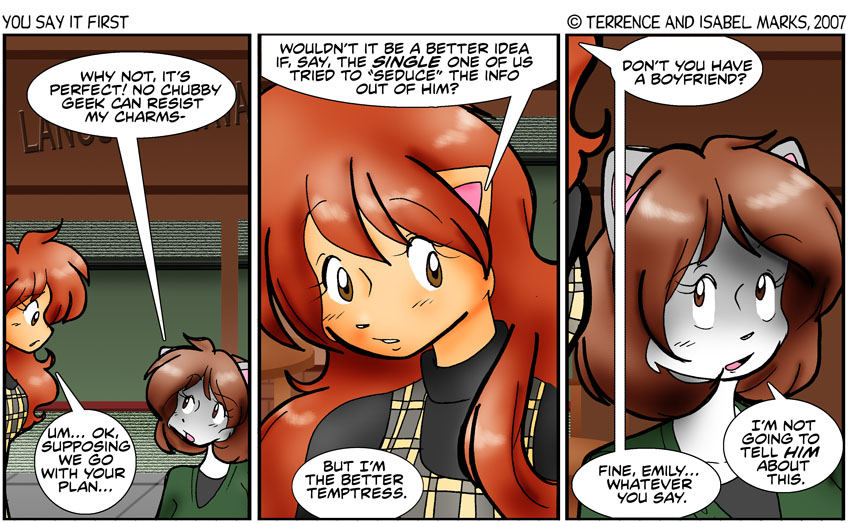 Note that Jake doesn't turn to face Emily. You'd think a potential paying customer would get his full attention but, well, Jake