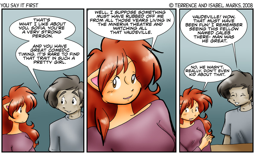 I love it when Isabel ties everything together like this. Caleb is a very good performer. We rarely saw him on stage in Unlike Minerva because of that - I didn't have any idea how to show a great vaudeville performance in three panels - Terrence