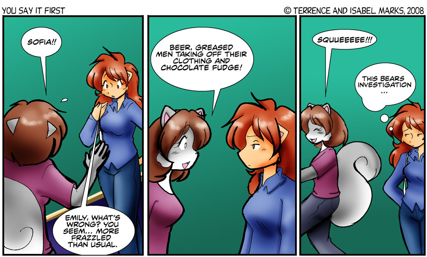 She's got me listening... Sofia's original line in panel three was " Well, she certainly got my attention...", but this one works better... it's more or less the way the line was reading in my head as I drew it, so it was pretty much set into stone.