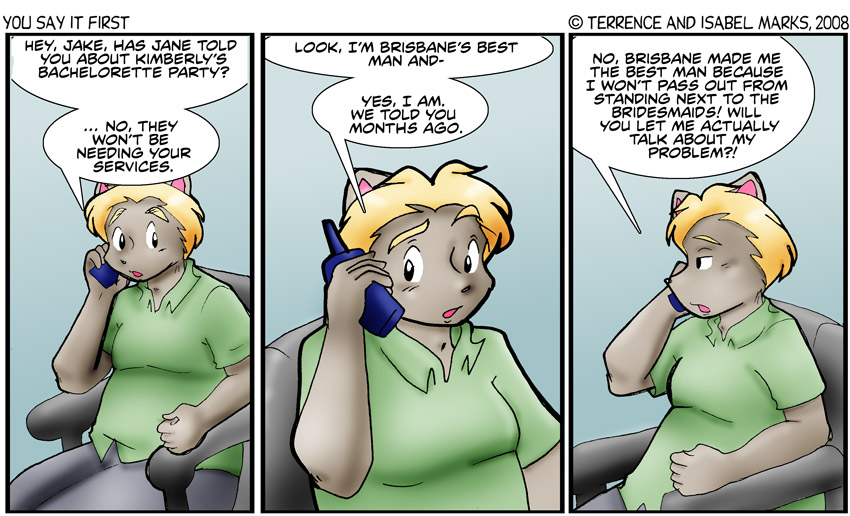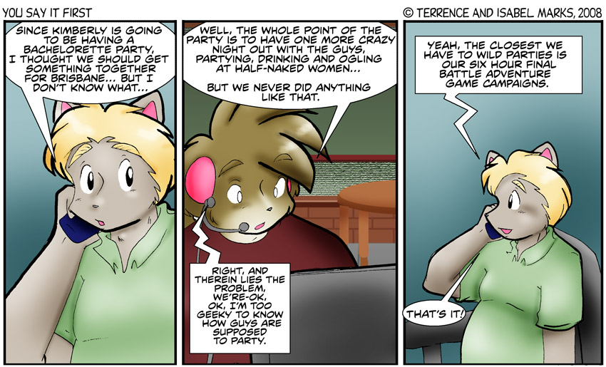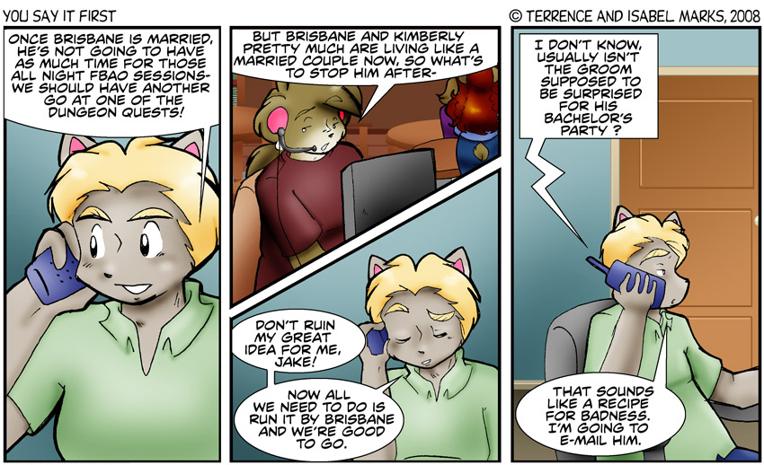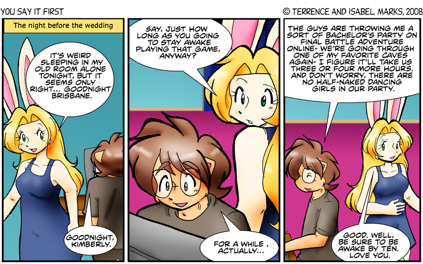 Original Commentary There are far too many 80's movies that start out with a bachelor getting a surprise bachelor party (sometimes without an actual wedding involved). Ok, I made that last part up... ok I made the last two parts up. I'm sure if such a movie existed in the 80's, I was (and probably still am) not allowed to watch it. That goes double for Brisbane, Jake and Robert. -Isabel Modern Commentary Is it supposed to be a surprise? Is that just something that we picked up from sitcoms or late-night comedy movies? It seems like that's a bad idea. It gives the groom plausible deniability but it also puts the groom in situations that require plausible deniability and that doesn't seem like a good trade-off - Terrence ![]() Thursday, February 28th 2008 - [1087] The night before the wedding (10 of 12)