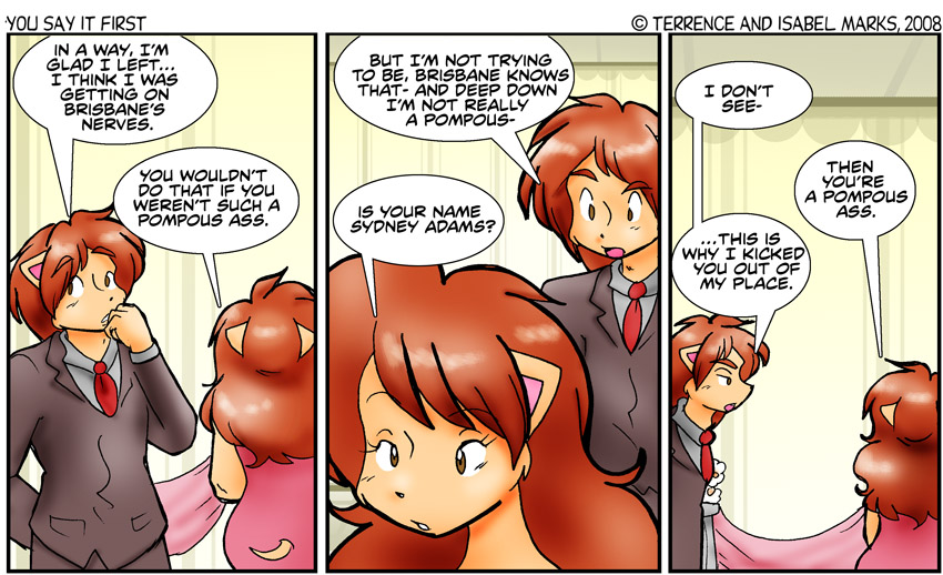 I was having trouble finding Sofia's emotion in these panels. I had originally saw her as more angry, then as not really caring while sketching while happy with a hint of evil while inking. I'm sure she's a mixture of all three emotions. I think Sofia took more after Sydney than Brisbane, personality-wise. Poor Sydney has no idea what he does to deserve this... the dense ones usually don't. -Isabel