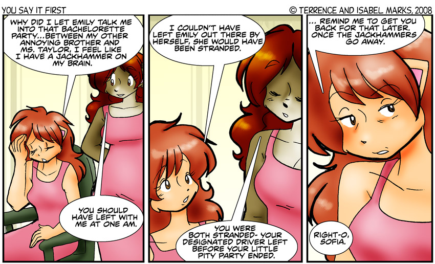 On one hand, the bacherlorette party might have been good namirdeiter.net material. On the other hand, it would've mostly just been Emily drinking and yelling at scantily-clad male dancers; if you can imagine how the first page or two goes, I'd expect the rest to be similar