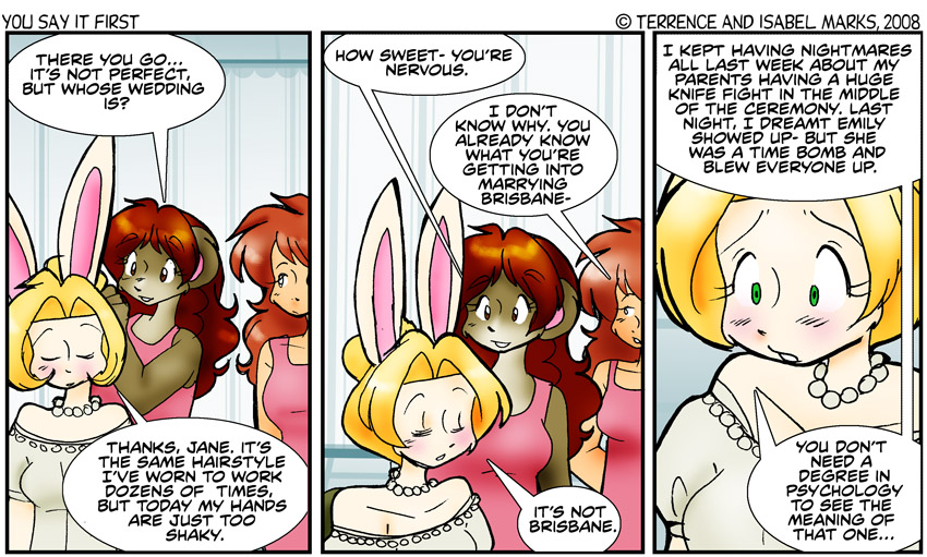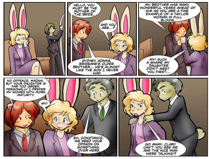 Is there any mother and daughter who ever fully agree on anything wedding related? I wouldn't know, as my own mother was 3,000 something miles away during my wedding... I think that was one of the things that made it hard to work on this arc, I'm happy for Brisbane and Kimberly, I really am, but man if this arc didn't bring up a few problems for me. Although I am grateful my wedding was like it was- I have a feeling if my side HAD been at the wedding, it would have been somewhat similar (drunken Bridesmaids and fighting mothers and daughters anyway) -Isabel