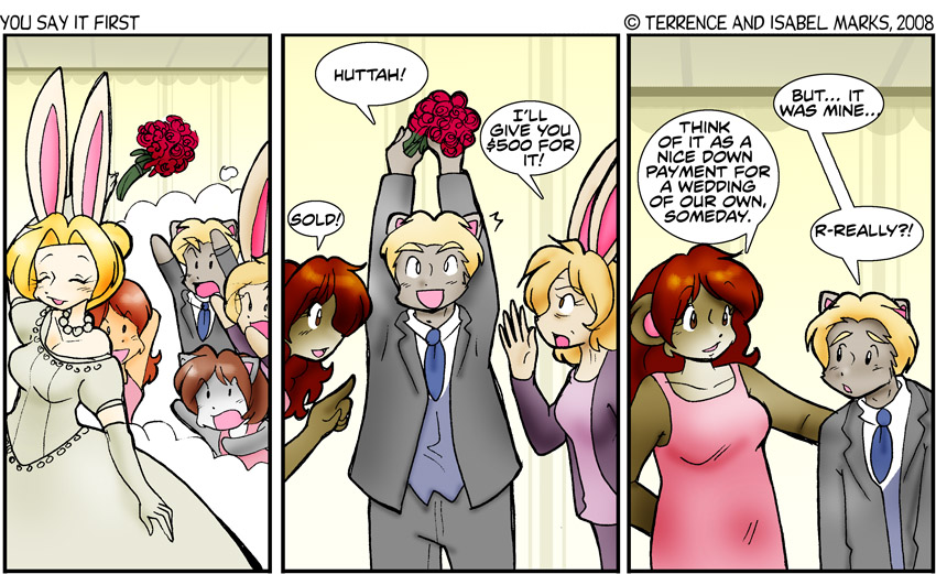 Original Commentary Technically, Kimberly's last name is now Taylor-Adams, but saying "Mrs. Taylor-Adams" didn't sound very romantic to me at the time, and still kind of doesn't. So, Brisbane took the romantic side. When doing arcs based on events that a lot of people have gone through, including myself, it's difficult for there to not be autobiographical moments. I ended up almost passing out myself, and pretty much felt like these two did after it was all said and done. I'd say I haven't felt that way since, but I actually had that same "all the blood in my body has left my head, making it feel ice cold and me wanting to lay down and/or throw up" feeling the day this comic (was supposed to have) aired. Or maybe the one before it. Either way. Weddings are always emotionally stressful ordeals and this one was no exception. Everyone involved is very glad to have this one done and over (and thankful we will never have to do it again ^_^). -Isabel Modern Commentary |