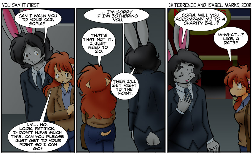 Everyone's feelings start getting stepped on by panel three... each insulted for their own reasons, Sofia's are pretty obvious, but Patrick's are not so much so... basically he's insulted more over her not just flat out saying yes (and instead asking him all these questions and wondering what his intentions are... don't say I blame her, though). -Isabel Modern Commentary