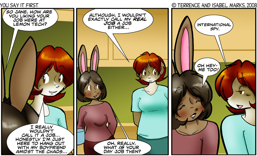 A showing of comradery- or at the least, a joke between budding friends. I'm sure Jane doesn't want to explain the subtle, yet important, differences between a waitress and barista. Personally, I don't blame her. -Isabel
