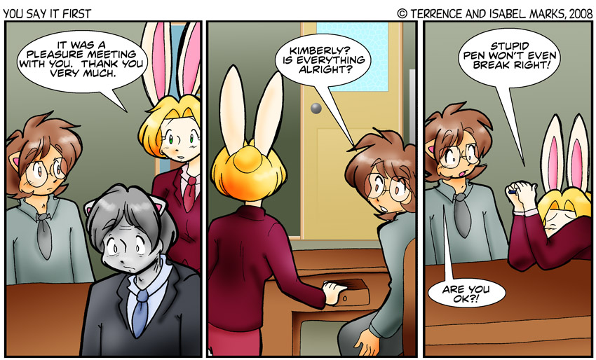 I like the idea of Kimberly grabbing the Robertson Pen from her desk, trying to snap it out of frustration, and failing. That's rather a lot for two panels, though. I wish I had thought more about how long it would take to convey that action.
