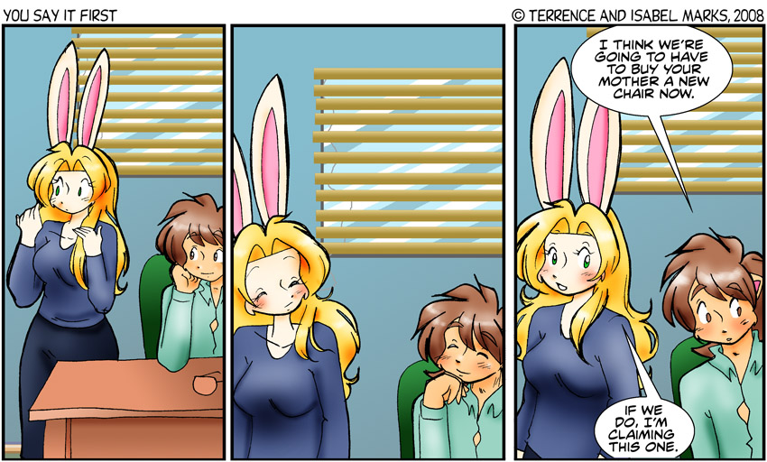 That's why we had the previous comic. To get from there to here. This is, I think, the second comic I wrote in the arc. I knew I had to use it somewhere around here. And yes, that is the same chair that Ms. Taylor had ordered in the previous arc. -Terrence