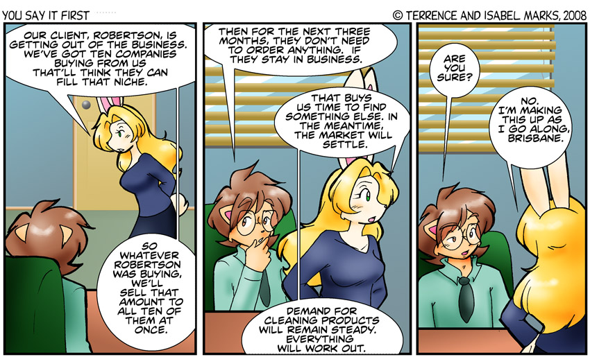 Originally, Kimberly was going to agree with Brisbane. Isabel brought up objections very similar to Kimberly's, and I had to admit that they made sense. So this comic (and several after it) were added. Because sex doesn't solve economic problems. -Terrence