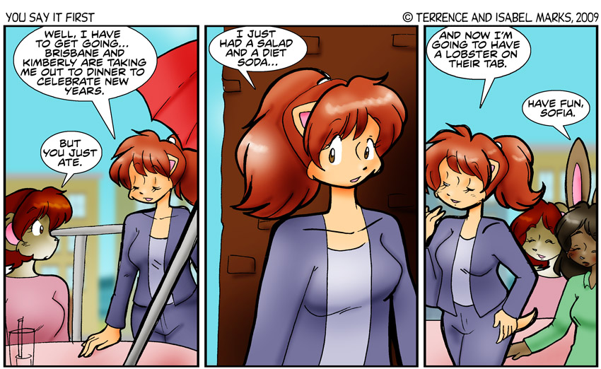 Original Commentary So where are they? At first, the idea would be that they were at a diner somewhere... then I thought "It should be outdoors". But when I sat down and threw it, I realized it was neither. They were hanging out on a very nice apartment balcony. This caused some small problems... in this comic, Sofia originally paid for the salad and soda. This goes a long way of showing what kind of respect she has for her friends vs. her family. -Isabel Modern Commentary |