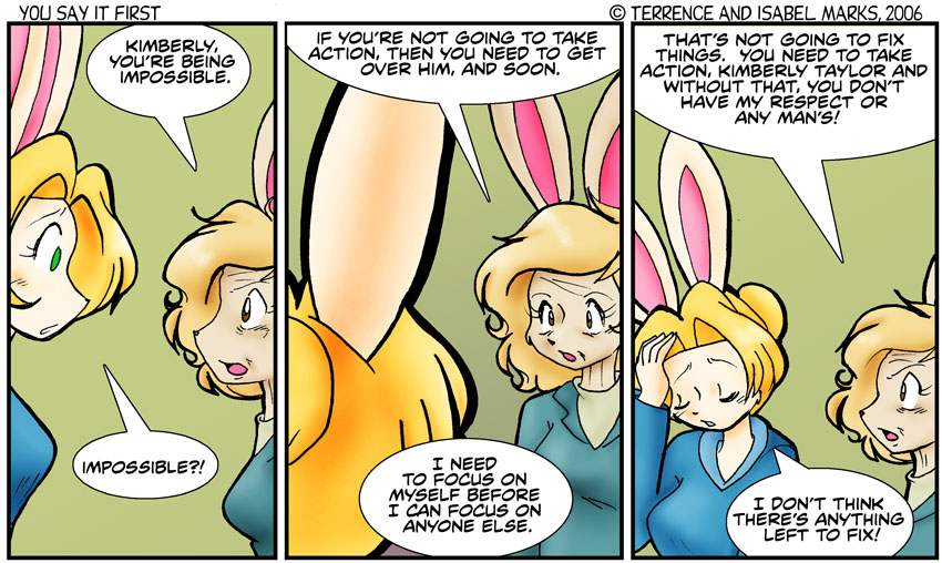 I really like how Kimberly came out in the last panel with her hand to her head. She looks exhausted; exhausted with the situation, exhausted with her mother, exhausted with herself. What I wanted to show is that she's tired, she's worn out. She's shutting down as a person, which I think pisses Ms. Taylor off more than anything - Isabel