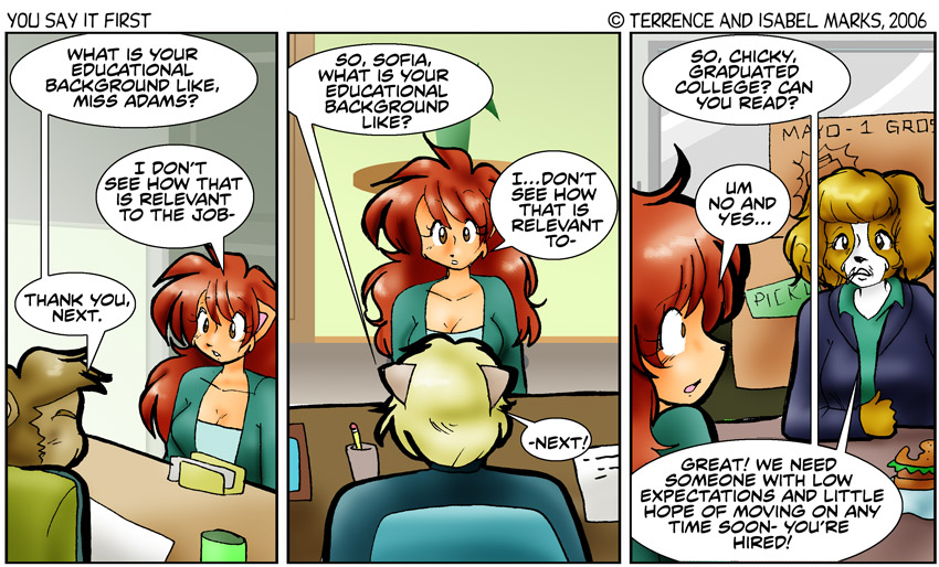 Note that the third panel is less an office, more of a storeroom with a table in it. Anyhow, that's Sofia's pride for you. She's not about to admit failure. She doesn't really acknowledge the validity of any educational institution that refuses to graduate her - Terrence