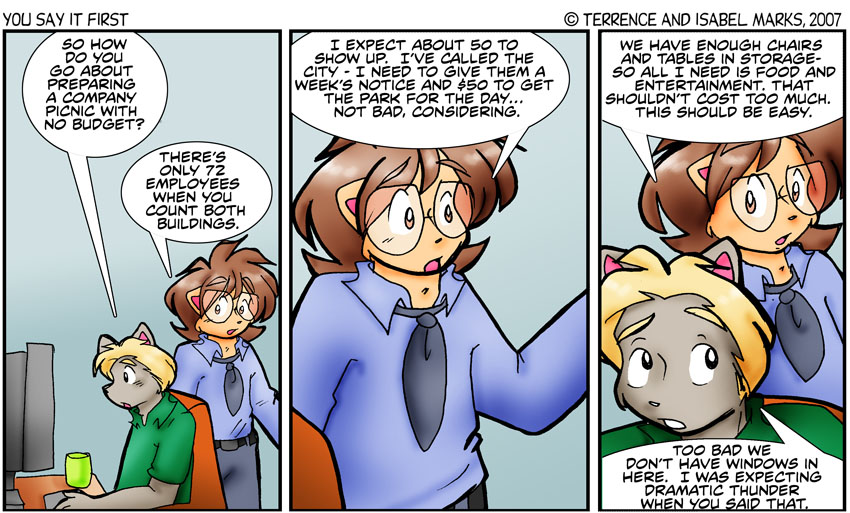 We had some small problems with Robert's last line- at first the comic called for him looking through a window, but there are no windows in the IT room. At first I was going to have him referencing weather. com, but Terrence thought that was a dead idea. Terrence came up with the final version of the line, thankfully.-Isabel