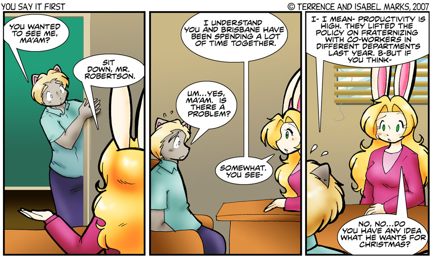 That "no fraternizing with coworkers in different departments" was one of Ms Taylor's ideas. She gets ideas like that when she's angry.
