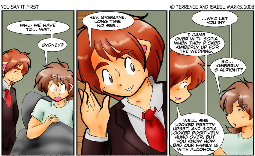 Introducing new challenger! Sydney pretty much uses Sofia's exact color pallet- which means one less character to add to the big wall of colors. Which I am thankful for. At this point it has not been expressed exactly that they are brothers and sister- but hopefully the casual way he is talking to Brisbane about their underage sister and drinking (and how young he looks) will not confuse people too much. Hell, I'm sure at least one person, hopefully not on .net, was confused as to who he is, especially since commentary was so late. But, here we all are... and Sydney is Brisbane's older brother - Isabel
