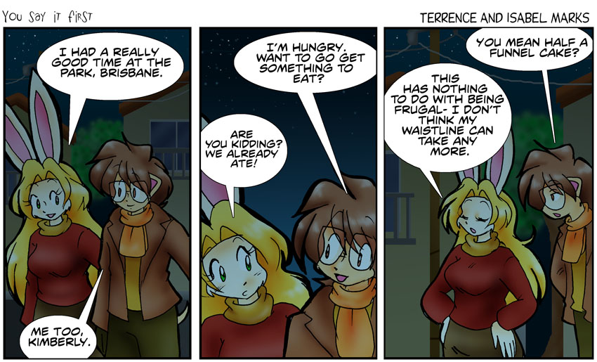 I suppose the idea of Kimberly, with her Barbie doll measurements, being worried about her weight should make me feel more secure as a woman. But it doesn't- considering she has no control over her weight- I do. So, have another piece of pie, Kimberly. When you get down to it- it's still about her being frugal... if she gained weight- she'd have to go buy a new wardrobe.