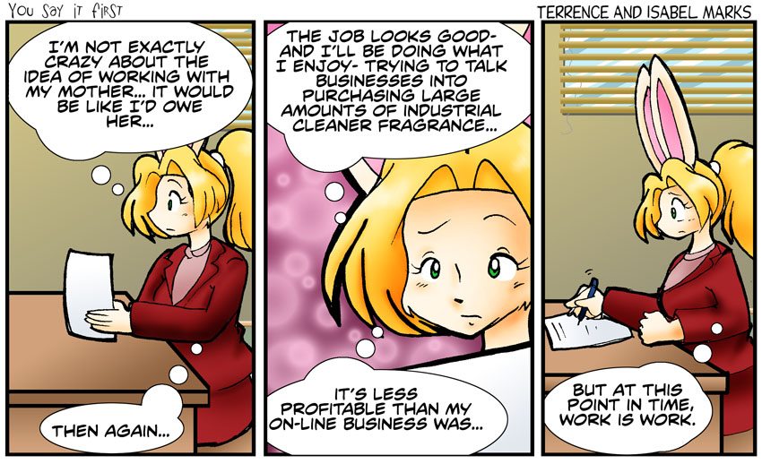 Kimberly's line in the bottom half of the second panel was originally "I wouldn't make as much money as I would if I was selling my own things", which is honestly a better line. More accurate. It's not about the total profit margin. It's about how much Kimberly personally takes home.