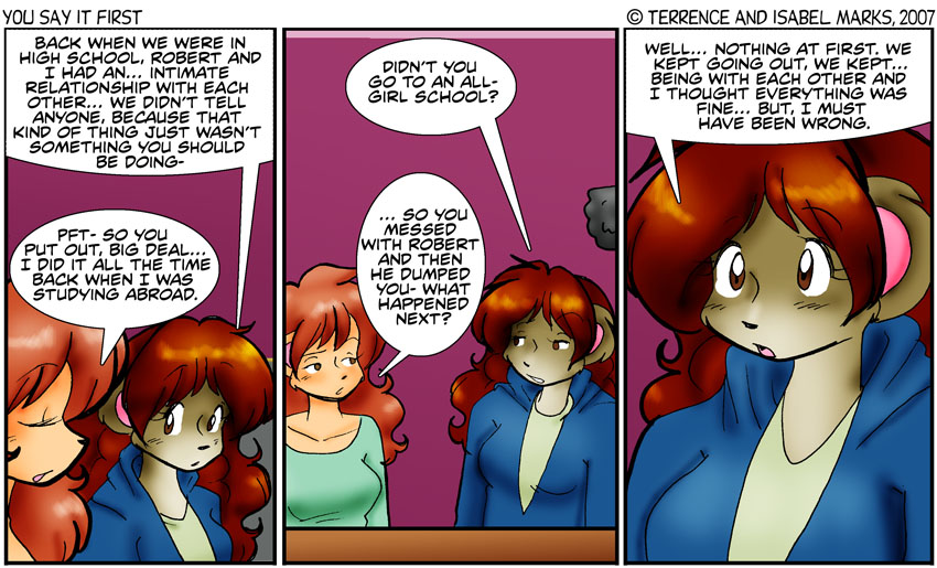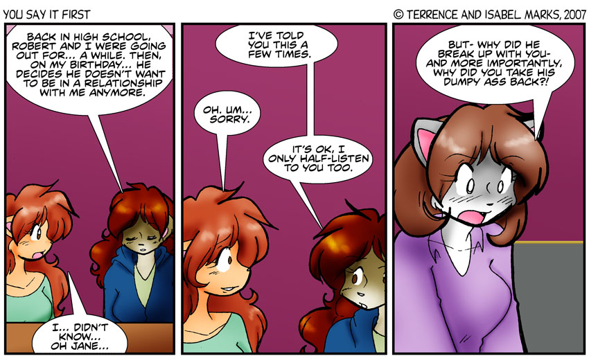...and now we find out a new piece to the puzzle of Robert and Jane. And perhaps a bit more about Sofia... actually, no. I wrote this arc, but asked Terrence about this comic and wanted his thoughts on it. He basically said Jane took it the wrong way. -Isabel
