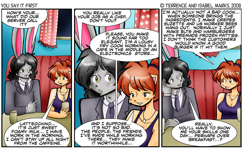 We were trying to think of something really fancy and French for Sofia to make, but we were at a blank. The script had *fancy food* in place of crepes until tonight. I was going to put down eggs benedict, but then Terrence suggested something actually good. Patrick's line in panel three is a pickup line... a very bad, not really appropriate considering everything pickup line... which I added in last minute. I wasn't going to originally simply because I didn't think there would be enough space in the panel, but there was so I added it in. Not that Sofia seems to notice. -Isabel
