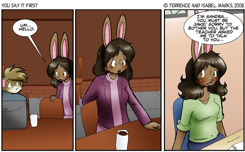 It was my goal to make this comic not seem too obvious, but at the same time to set things up so you can see it. Terrence told me it was just enough setup and foreshadowing... I do hope so. Although Jane does seem a bit too mean in panel two... Jake is tough though, and takes everything Jane says with a grain of salt. -Isabel Modern Commentary