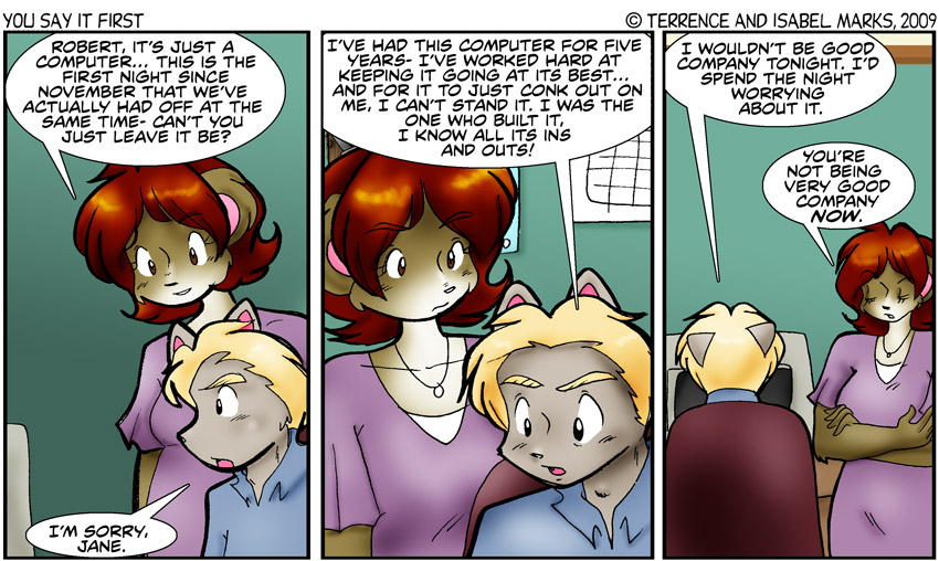 For some reason, I could have sworn panel two's back ground was facing the same was as panel one's. I had drawn no blank poster or calendar in it's background. So I had to track down one of the larger versions from a previous comic and copied and pasted it in. Considering Robert's geekish macho rant covered up most of it anyway, I doubt anyone would have noticed if I hadn't brought it up. -Isabel